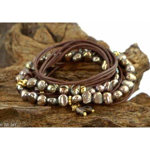 By detaching the leather band you can also wear just the pearl necklace as a short necklace or bracelet. Replace the leather band with a silver necklace for more sparkle. When you untie the knot and unfasten the clasp, you can pull the leather string through the sliver ring on the other side. Enjoy!